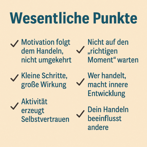 Warten auf Motivation ist wie Warten auf gutes Wetter in Deutschland – möglich, aber nicht planbar. Wenn du beginnst, aktiv zu werden, entwickelst du nicht nur Motivation, sondern auch Klarheit, Selbstbewusstsein und Verbindung zu anderen.