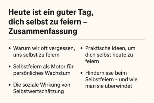 In unserem Leben hoffen wir oft auf die echten Erfolge, die großen Meilensteine und wir warten auf den richtigen Moment, um stolz auf uns sein zu können. Doch eigentlich könnten wir jederzeit die Kerzen anzünden und den Konfettiregen starten. Ein inneres High-Five ist längst angebracht. Denn wer sich selbst feiert, stärkt nicht nur sein eigenes Herz, sondern auch die Herzen der anderen.