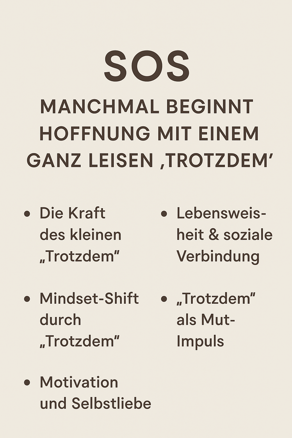 Denn wenn wir trotz all der Hindernisse in unserem Leben handeln, dann spüren wir diese Stärke in uns. Die Stärke, das Leben selbst zu gestalten. Und wir inspirieren andere – auch das ist Teil unserer Wirksamkeit. Denn Hoffnung kann ansteckend sein. und ein Mensch, der im Alltag leise weitermacht, der stärkt sein gesamtes Umfeld. Dieses kleine „Trotzdem“ ist wie ein Gummiband. Es lässt nicht los und hält die Spannung – gibt dir aber dennoch die Kraft zu handeln.